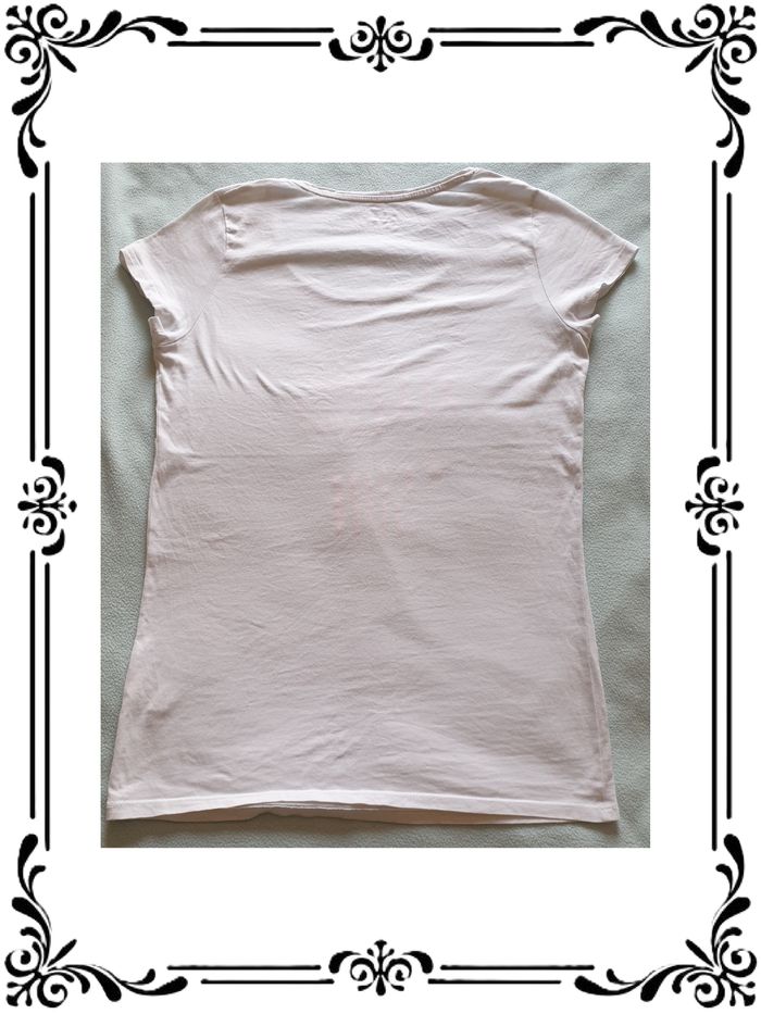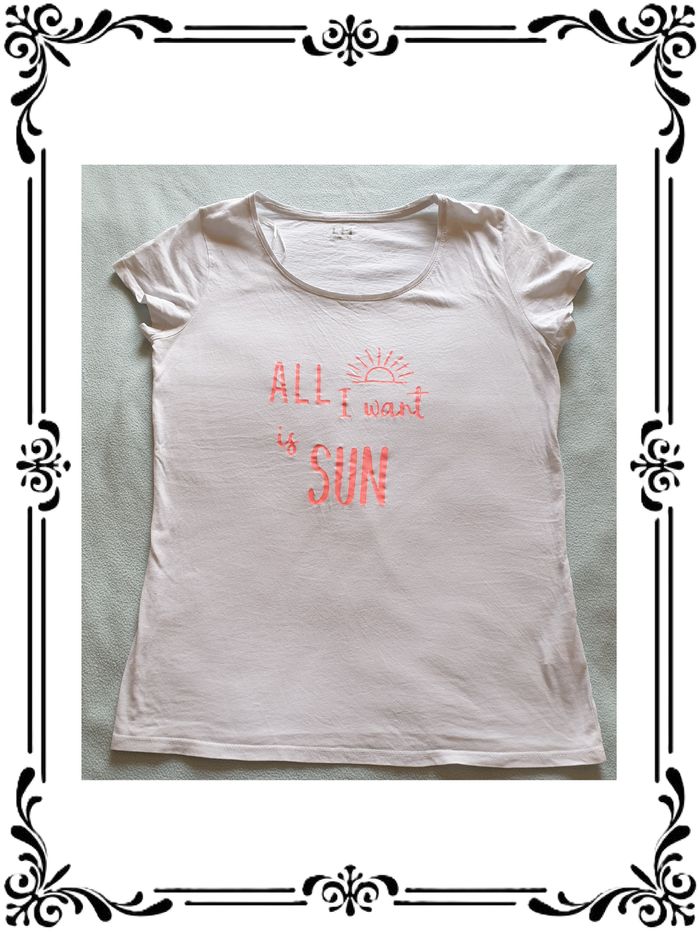 Tee shirt taille 38. Tee shirt manches courtes blanc avec écriture rose. Tissu extensible sur 7 cm en largeur. 100 % coton. Largeur d'épaule à épaule: 36 cm Largeur sous les bras : 45 cm Largeur à la taille: 41,5 cm Largeur en bas: 45 cm Hauteur du décolleté à partir des épaules: 13,5 cm Longueur totale: 62 cm Longueur des manches: 13 cm En très bon état. La Halle. 3€. #vero38110vetementsfemme38