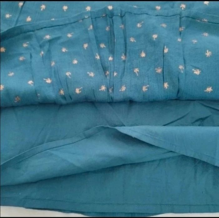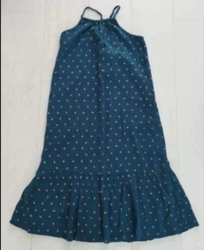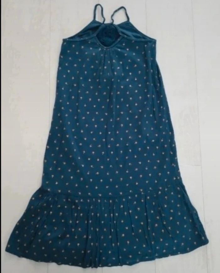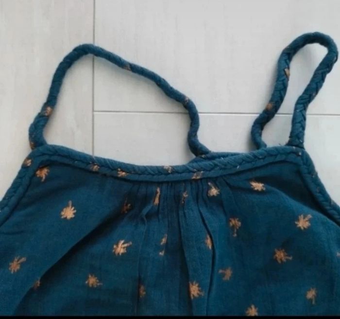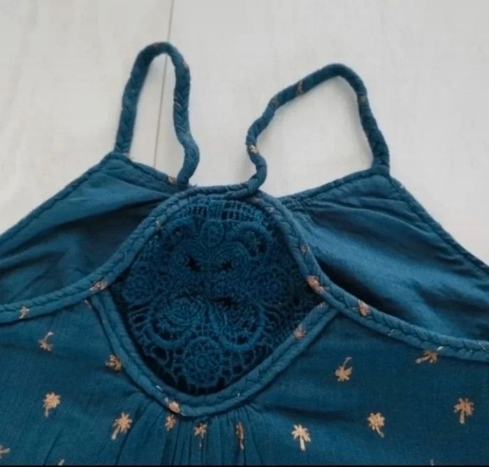Bleu/vert canard à motifs palmiers dorés, bretelles non réglables, dentelle dans le dos, longueur environ 92 cms