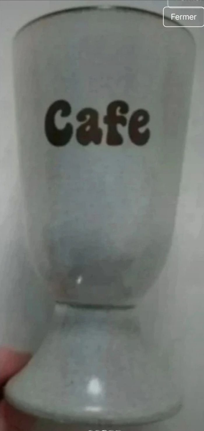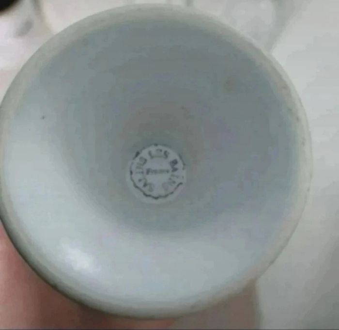 Gris clairs avec bordure marron, écriture marron ; 14 cms de hauteur sur 8 cms environ de largeur ; 1 des 4 mazagrans présente sur le pied deux petits traits d'origine. Fabrication de salins les bains.