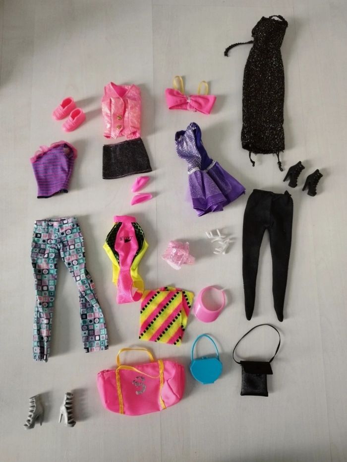 Enfant et barbie en bon état, ken en état correct car une main coupée / bras articulés pour barbie et enfant / accessoires (maillot de bain, sacs, chaussures, tenues) dans différents états