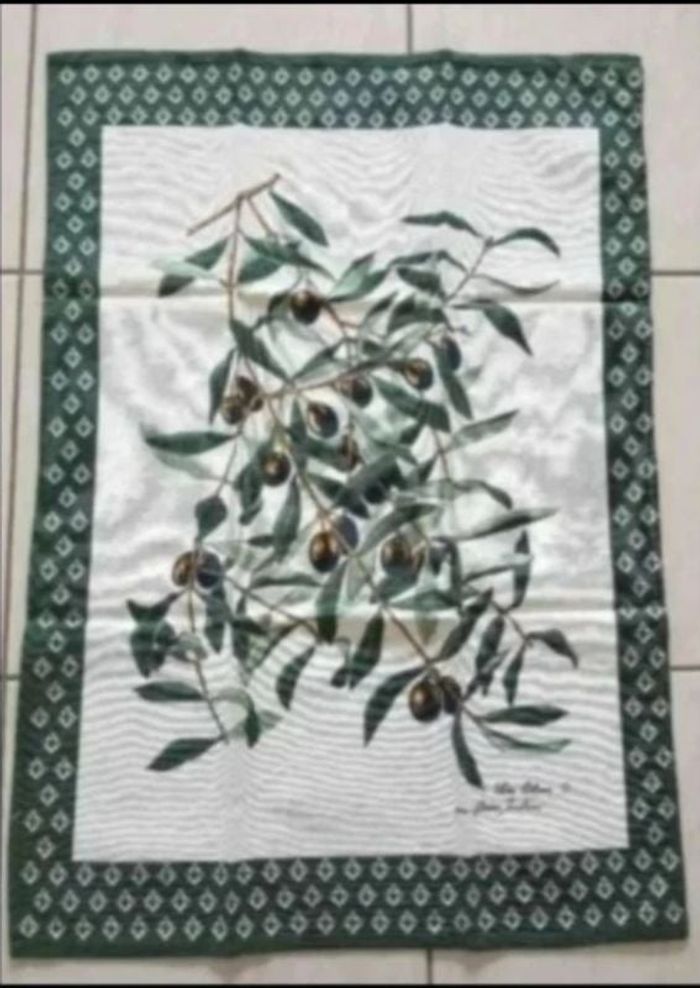 Les olives par Didier Joculano / un torchon beige à rayures rouges offert pour l'achat de ce torchon