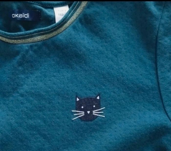 Verte (ou bleu canard) avec motif chat à la poitrine et lien de serrage.