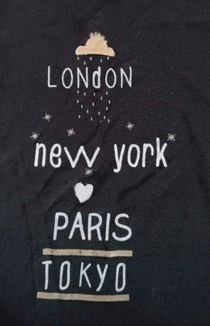 Entre pull et tee shirt, noir avec motifs blancs, roses et dorés, taille plutôt 11 ans pour ma part