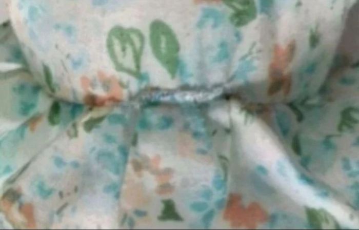 26 cms environ, yeux et nez en plastique, reprise couture cachée sous le volant de la robe.