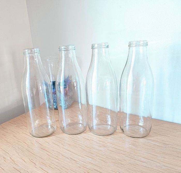 Lot de 4 bouteilles en verre - Sans couvercle - Contenance : 1 litre ❌ Excellent état et entièrement nettoyée pour la vente #bouteilleenverre #bouteilleajus #bouteillealait