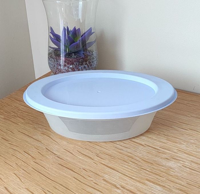 Boite de conservation style Tupperware - Ovale - Transparent avec couvercle lavande - Dimensions : 26 x 15,5 x 7,5 cm - Passe au micro ondes (+110°), au congélateur (-40°) et au lave vaisselle ❌ Excellent état, (peut avoir de légère imperfection dûe à son utilisation) #boitedeconservation #tupperware #boiteovale #boiteenplastique