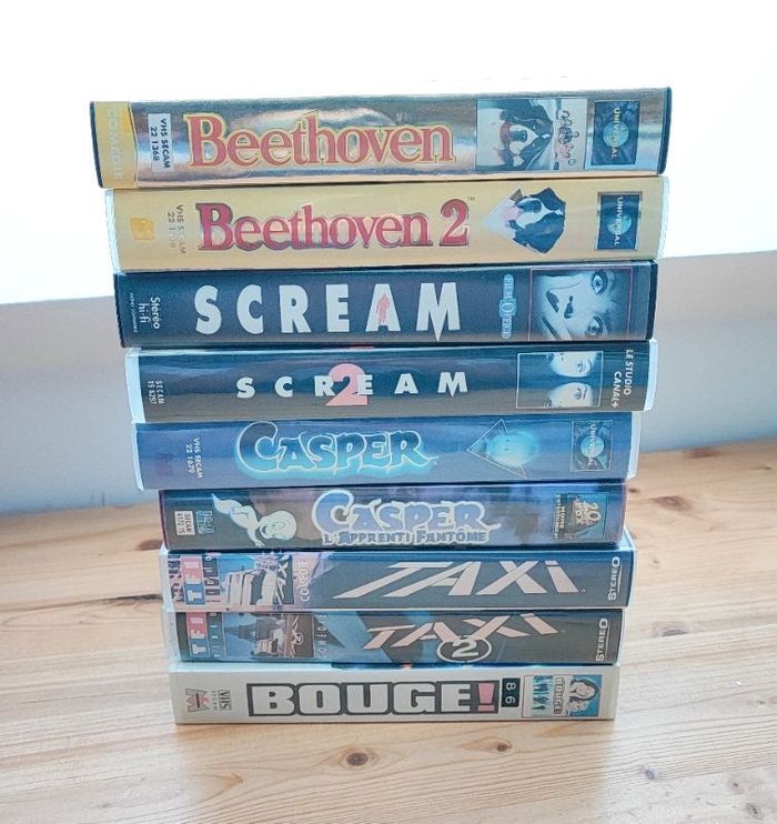 Lot de 9 VHS - Beethoven 1 et 2 - Scream 1 et 2 - Casper 1 - Casper 2 " l'apprenti fantôme" - Taxi 1 et 2 - Bouge ❌ Bon état car beaucoup regardé mais reste correct [ #vhs #beethoven1 #beethoven2 #scream1 #scream2 #casper #casperlapprentifantome #taxi1 #taxi2 #bouge #vintage #k7video #cinema ]
