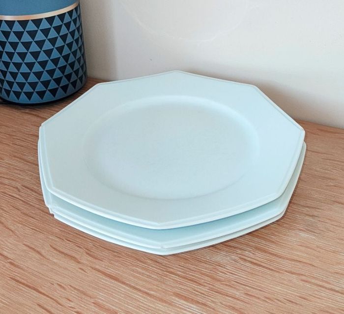 3 grandes assiettes LIMOGES FRANCE - Blanc - Plate - Forme octogonale - En faïence - Diamètre : 25 cm - Hauteur : 3 cm ❌ Bon état car abîmées comme le montre les photos [ #assietteplate #assietteoctogonale #grandeassiette #assietteblanche #limogesfrance #assietteenfaience ]