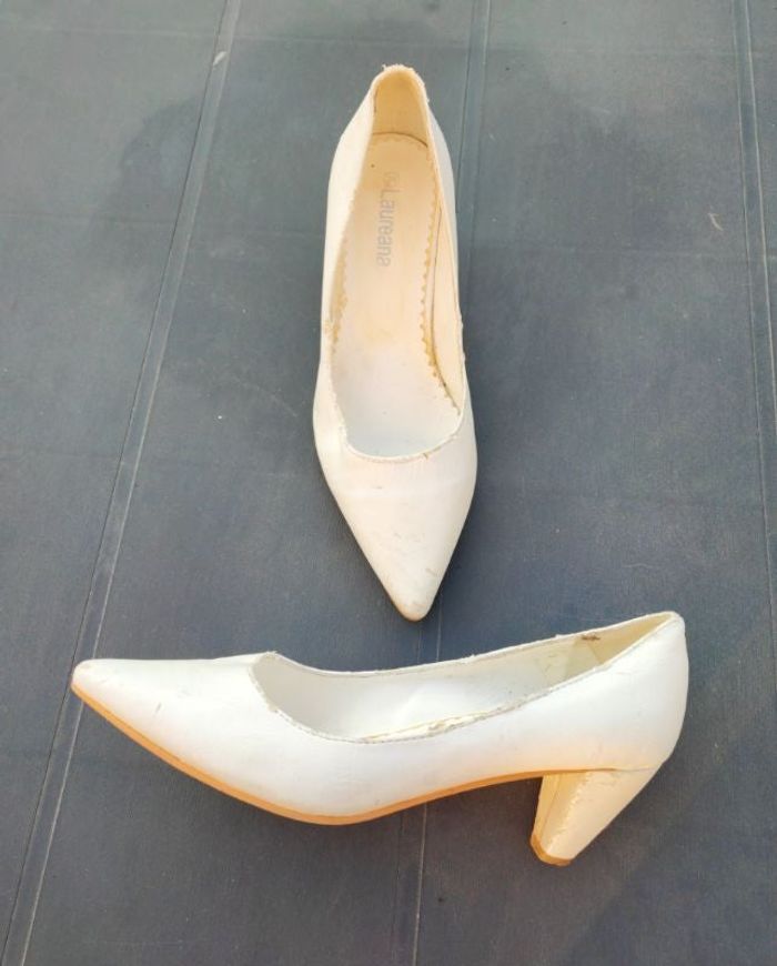 Escarpin fermé de la marque LAUREANA - Blanc - Talon : 6 cm - Pointure : 39 - Idéal pour une cérémonie ou autre seconde vie ❌ Satisfaisant car usé à plusieurs endroits et la matière extérieure s'enlève par endroit mais l'intérieur reste correct ➡️ Seront entièrement nettoyé pour la vente [ #escarpinblanc39 #chaussurefemme39 #chaussureceremonie39 #chaussureblanche39 ]