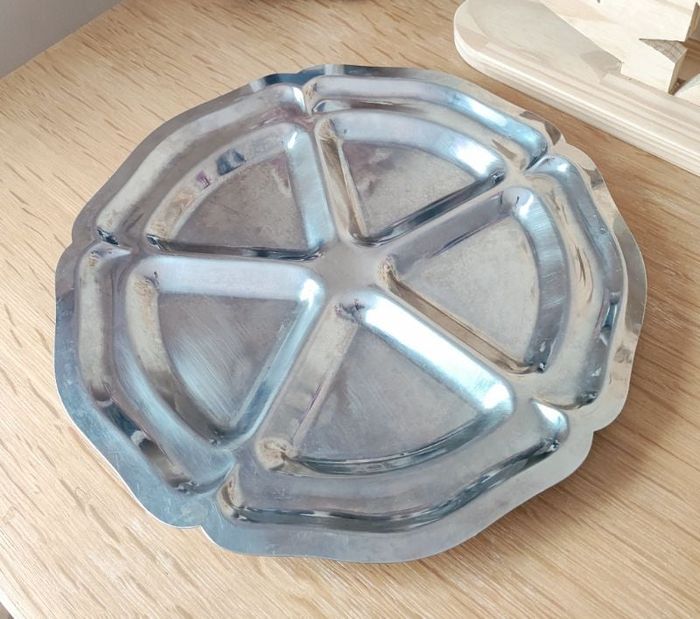 Plat à amuse-bouches - Inox - 5 compartiments - Diamètre : 35 cm environ ❌ Excellent état, comme le montre les photos
