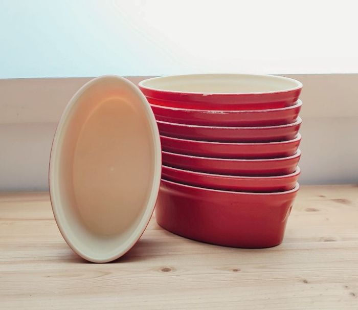 Lot de 8 terrines ovales en plastique alimentaire Cuisson, pasteurisation, mise sous vide et passe au micro-onde 🎗️ Dimensions : 18 cm x 11 cm x 6,5 cm ⬆️ Contenance : 700 ml ❌ Excellent et juste la couleur qui est partie par endroits et certains ont le dessus un peu râpé a cause du passage de la lame de couteau 🧽 Sera entièrement nettoyée pour la vente