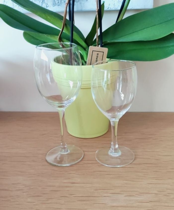 Lot de 2 verres à pied (eau et vin) 🎗️ Petit : Hauteur : 16,5 cm - Profondeur : 8,5 - Diamètre : 6 cm Grand : Hauteur : 19,5 cm - Profondeur : 9,5 cm - Diamètre 6,5 cm ❌ Excellent état