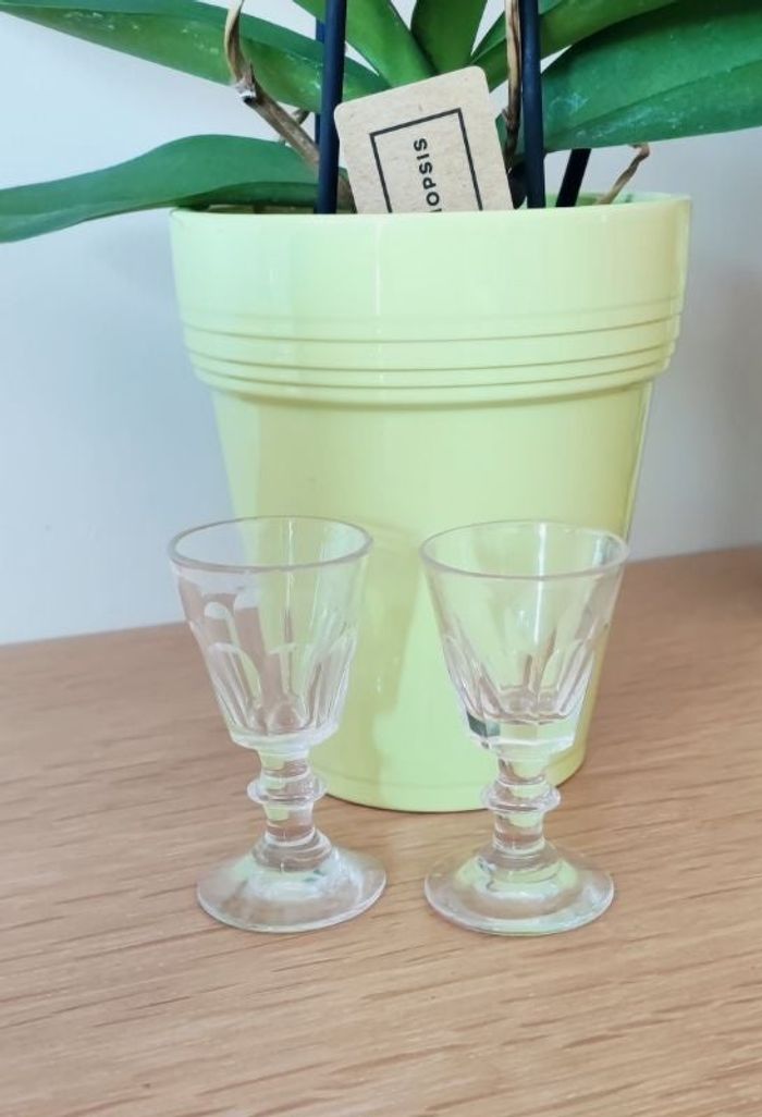 Lot de 2 petits verres épais à pieds 🎗️ Hauteur : 8,5 cm - Diamètre : 4,5 cm - Profondeur : 4 cm ❌ Excellent état