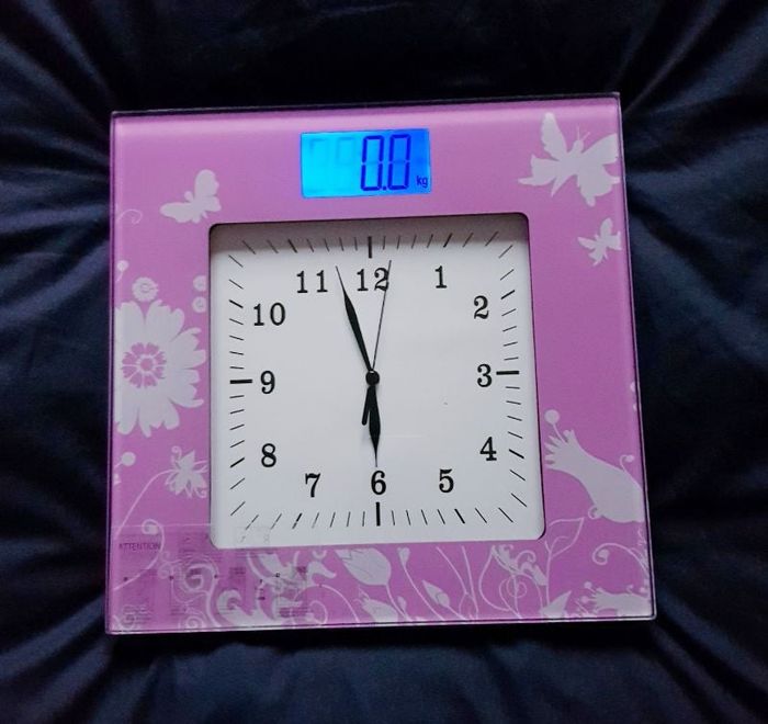 Pèse personne digital avec horloge en verre sur le dessus avec motif papillons et fleurs 🔋Fonctionne avec 2 piles AA (non incluses) ❌ Très bon état de fonctionnement (juste des rayures sur le dessus du verre) mais qui gênent en rien à son utilisation