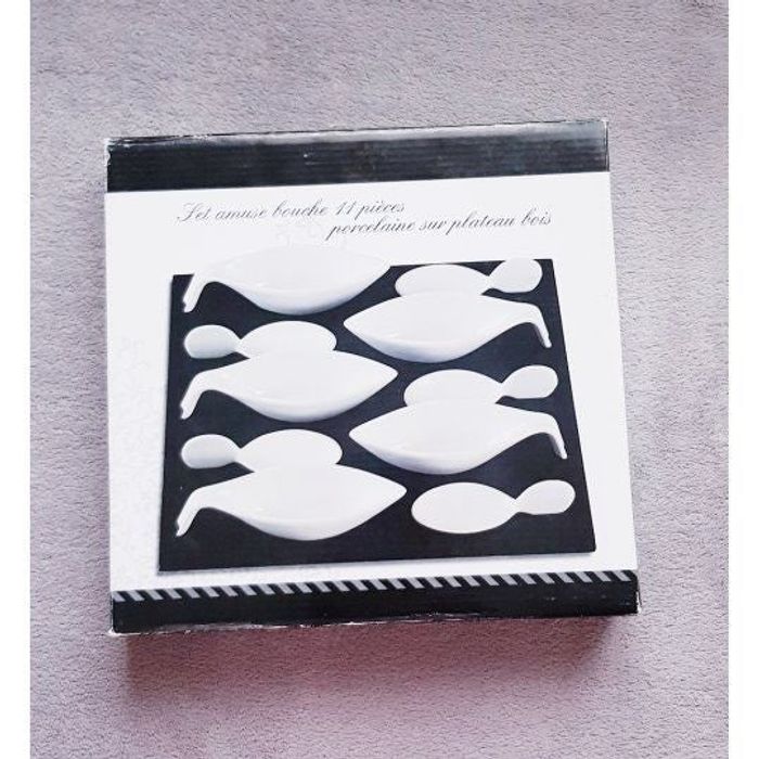 Set amuse bouche 11 pièces en porcelaine blanche et plateau en bois noir pour faire le service. ❌ Neuf dans son emballage d'origine