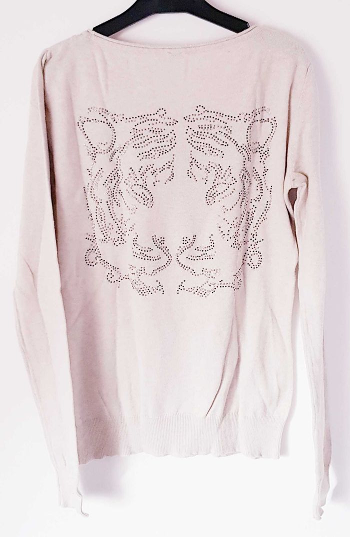 Pull col rond avec motif tigre clouté, beige chiné 👩 Taille : M (38/40) ❌ Excellent état, juste l'étiquette de la taille qui est manquante.