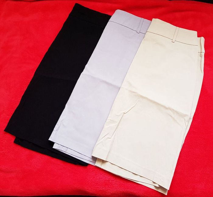 Lot de 3 jupes (noir, gris, beige) fendu sur l'arrière, passant à ceinture. Ouverture zippée dans le dos 👩 Taille 40 (peut convenir à un 42 car il y a de l'élasthanne) 🎗 Largeur de la taille à plat: 40 cm - Longueur : 54 cm ❌ Excellent état (comme neuve) car très peu portées
