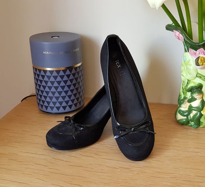 Escarpin en daim noir Talon : 6 cm Pointure : 41 (longueur semelle intérieure : 26 5 cm) ❌ Très bon état car porté 1 fois, mais elles ont une tache de colle sur les 2 chaussures (voir photo) mais qui gêne en rien à son utilisation.
