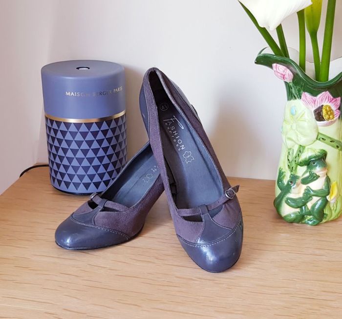 Escarpin en PVC et daim, gris 🐾 Pointure 41 ⬆️ Talon : 9 cm ❌ Satisfaisant car bien porté et abîmé sur l'arrière.