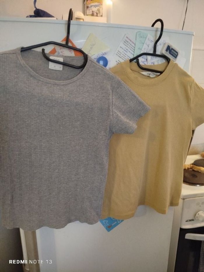 #kytie10ansfille. 2 t-shirt manches courtes taille 10 ans pour le gris de Marc Zara côtelé en état neuf et 9 10 ans taille un peu grand de couleur beige de marque H&M comme neuf côtelé aussi pas le même côtelage que le gris mais côtelé en excellent état comme neuf ref ZH34