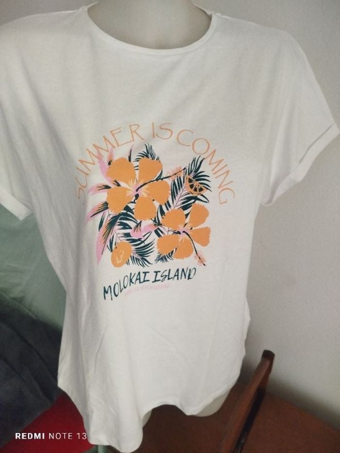 #kytie42femme. Tee-shirt manches courtes taille 42/44 neuf de couleur blanc fleurs de marque esmara mesure des aisselles 52 cm hauteur 60 cm en état neuf 100 % coton léger et fin réf ES34