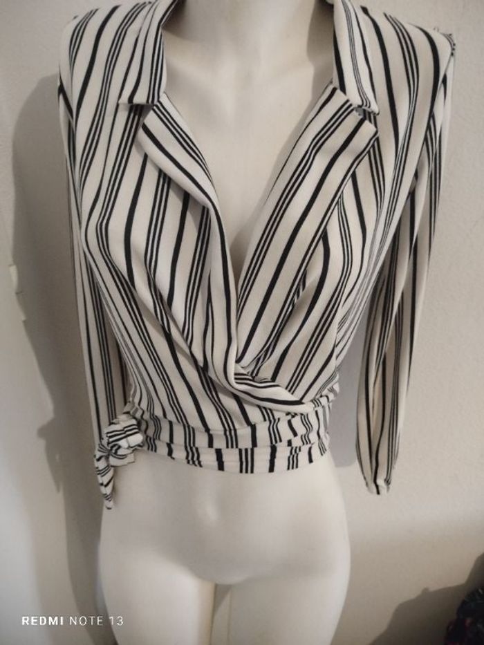 #kytieSfemme. Cache coeur taille S manches longues de marque Jennyfer noir et blanc avec ceinture sur le côté grand col v poignée élastique en état neuf léger fuide et souple mesure des épaules 38 cm mesure des aisselles 40 cm hauteur 45 cm réf DCM34