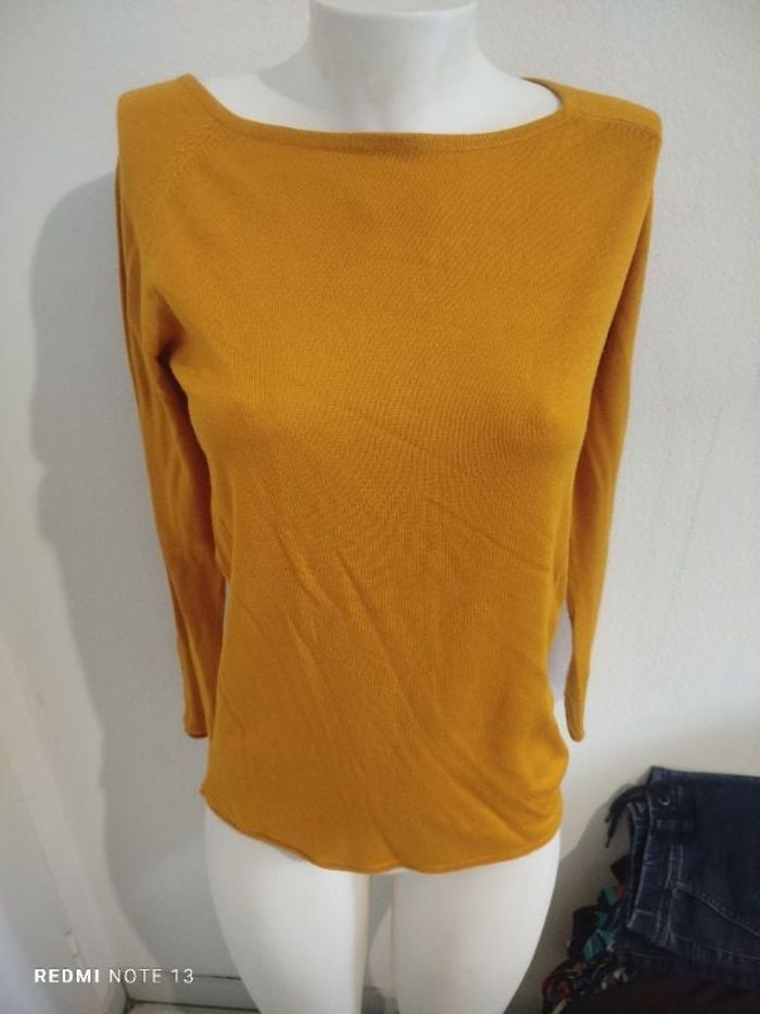 #kytieSfemme. Pull tunique manches longues taille S de marque only plus court devans col ras souple et fluide de couleur moutarde neuf mesure des aisselles 48 cm mesure du pull devant 65 cm au dos 70 cm 80 % viscose 20 % polyamide et élasthanne ref ON34