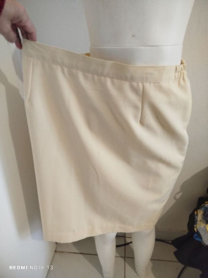 #kytie50femme. Jupe taille 50 de couleur jaune pastel doublé de marque roanne zippé dans le dos avec un bouton taille élastique mesure de la taille 46 cm élastique tirer au maximum 50 cm hauteur 60 cm 100% polyester réf Ro34