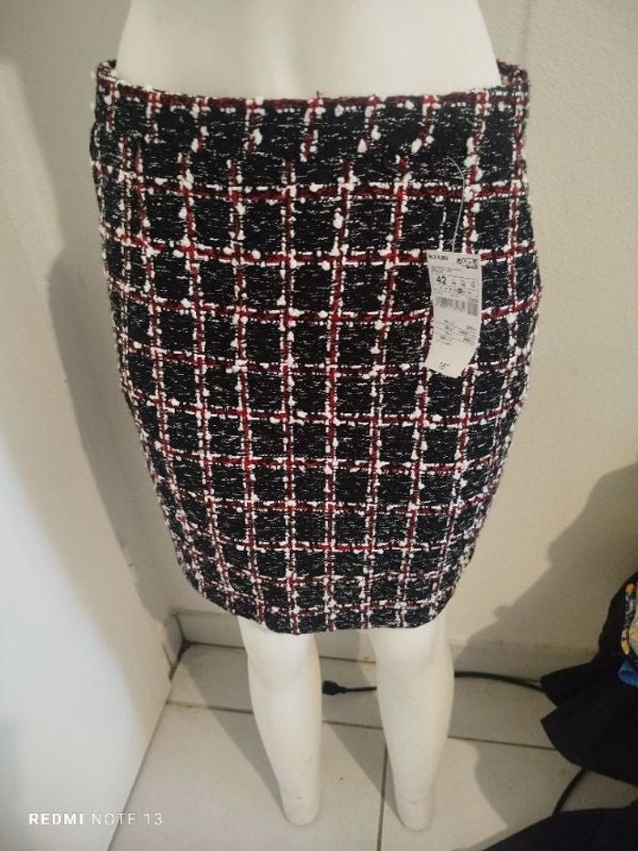 #kytie42femme. Jupe taille 42 de marque Kiabi en bouclette poche avant mesure de la taille 42 cm des hanches 50 cm hauteur 50 cm la jupe n'est pas doublée elle est 80 % polyester 7 % viscose 5 % acrylique deux couleurs noir vichy rouge et blanc se ferme par une fermeture éclair sur le côté en état neuve ref B34K