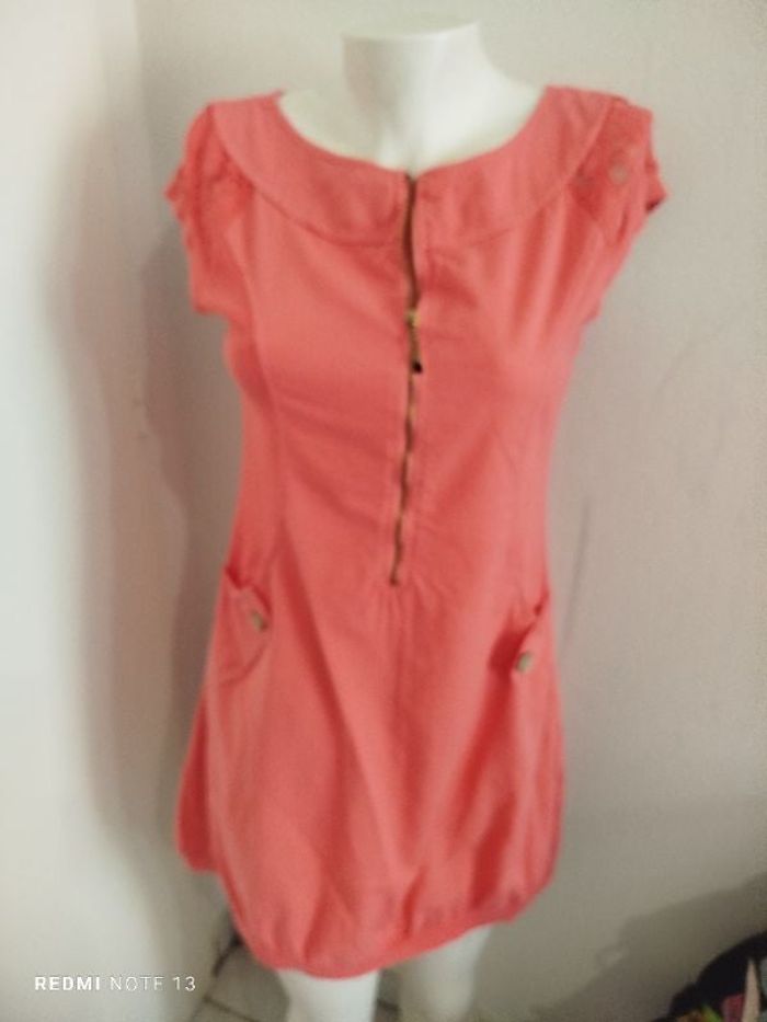 #kytietailleuniquefemme. Robe manches courtes taille unique de couleur corail dentelle sur les manches zippé va de la taille S a la taille L en état neuve poche avant mesure des épaules 36 cm mesure des aisselles 42 cm hauteur de la robe 85 cm 85 % coton 15 % lin réf Lin34