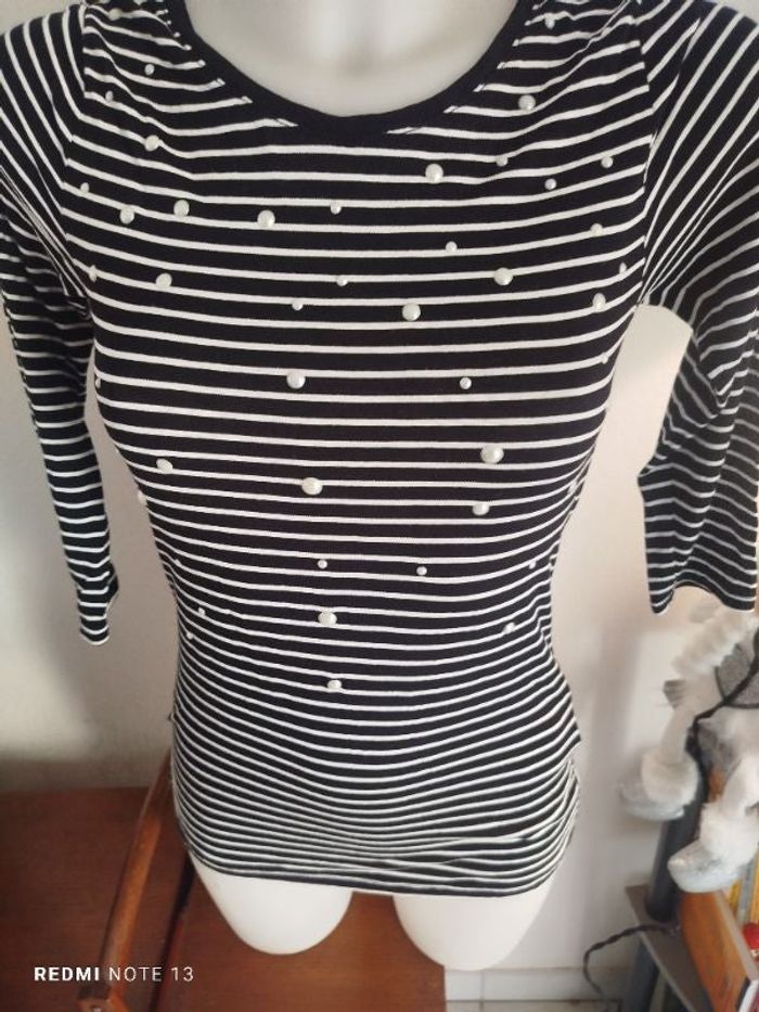 #kytieSfemme. Tee-shirt manches 3/4 léger taille S de marque camaïeu blanc et noir perle nacrée blanche en excellente état neuf mesure des épaules 32 cm mesure des aisselles 38 cm hauteur 65 cm 100 % viscose ref Cam34