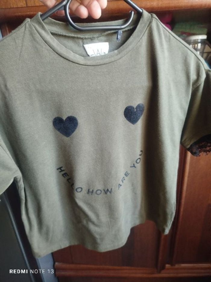 #kytieXXSfemme. Tee-shirt manches courtes oversize taille XXS de marque IKKS col rond en parfaite état le bas des manches étant dentelle noire l'inscription est en velours noir avec le petit cœur de couleur kaki mesure des épaules 44 cm des aisselles 44 cm hauteur 50 cm réf ik34