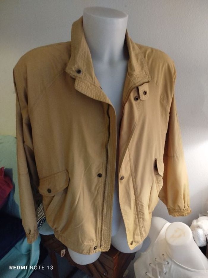 #kytie54homme. Blouson taille 54 de couleur beige moutarde de marque clapman movie style wear en état neuf zippé avec dépression sur le devant poche avant zippé avec pression ce qui fait une double poche pression au niveau des poignées donc mesure des épaules d'une épaulette à l'autre cela fait 60 cm de hauteur 75 cm et aisselles a aisselle 70 cm réf clap 54