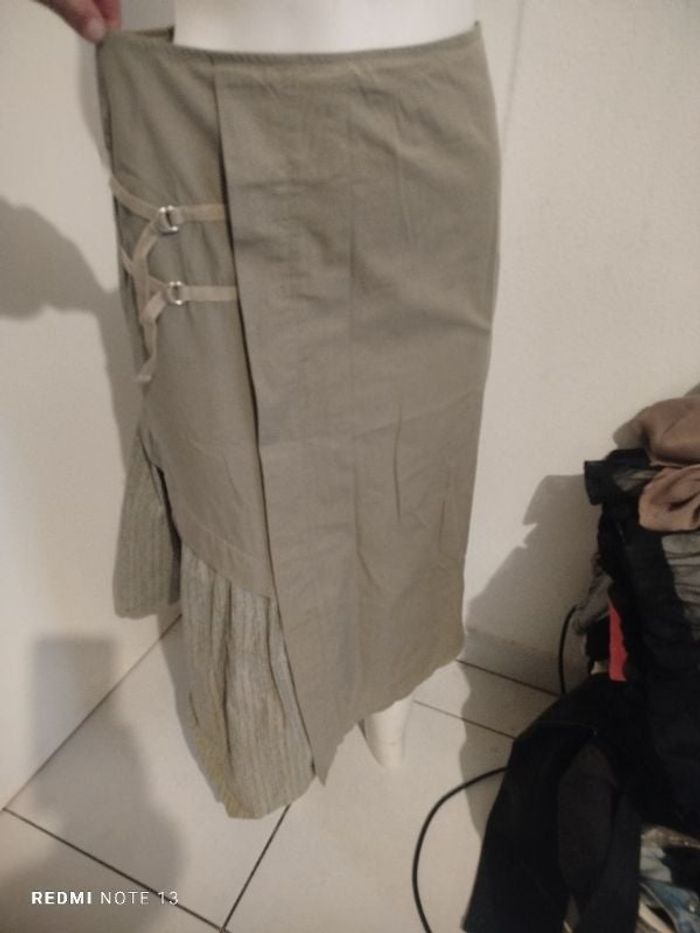 #kytie38femme. Jupe longue taille 38 de marque cache cache neuve de couleur kaki gris taupe se ferme par une fermeture éclair dans le dos lasagne sangle su rle côté droit tissus fleurie a pris sur le bas de la jupe une fausse poche sur la cuisse du côté gauche 100 % coton légère et fine très confortable et fait cartonné les très légères mesure de la taille 38 cm mesure des hanches 50 cm longueur de la jupe 70 cm réf CH34