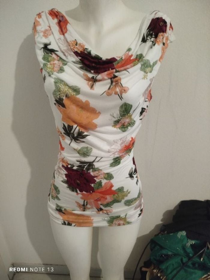 #kytieMfemme. Tunique manches courtes taille M de marque H&M blanc doublé fleurie en microfibre élastique en super état comme neuve souple et légère fine très confortable froncé sur les épaules mesures des aisselles 40 cm hauteur aussi français sur les côtés 70 cm tissu très très doux 100 % viscose ref H240