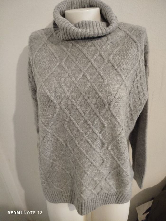 #kytieMfemme. Pull manches longues col roulé taille M gris torsadé de marque esmara en état excellent comme neuf mesure des épaules 52 cm des aisselles 52 cm hauteur 65 cm réf E45