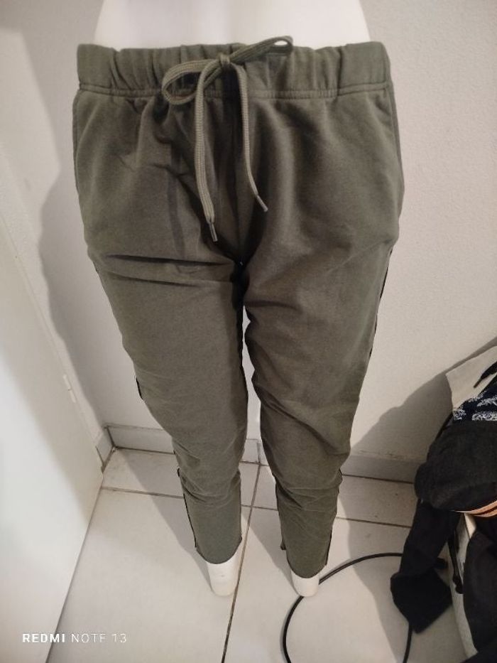 #kytieLfemme. Jogging taille L taille élastique avec cordon de couleur kaki cheville coupé en style poche avant en état neuf mesure de la taille 42 cm tour de cuisse 60 cm hauteur 85 cm cheville 25 cm avec liseret noir doré et blanc ref A90