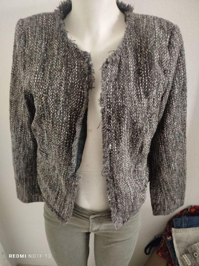 #kytie44femme. Veste manches longues taille 44 de marque camaïeu en bouclette neuve de couleur grise anthracite avec de micro francs je sur tout le long fausse poche avant et Paulette au niveau des épaules avec du fil métallisé de couleur rose poudré et blanc la veste ne s'attache pas intérieur satiné qui est en polyester de couleur noire la veste est 48 % acrylique 30 % polyester 20 % en laine et 2 % en fil métallisé mesures de la veste épaule à épaule 42 cm des aisselles 52 cm et la hauteur est de 55 cm réf CM 38