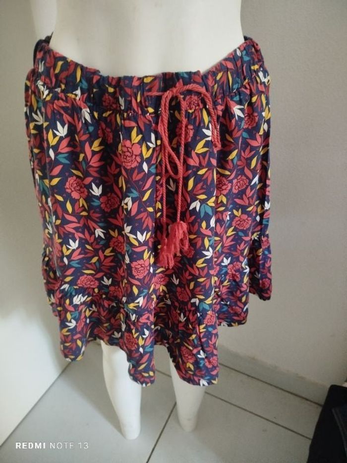 #kytieLfemme. Jupe mi longue taille L de marque inextenso en état neuve taille élastique avec cordon 🎀 fleurie sur fond bleu marine de couleur rouge orangé Bordeaux maronner rouge et moutarde et plat mesure de la taille 40 cm hauteur de la jupe 50 cm fluide et souple et fine très confortable ref IN34