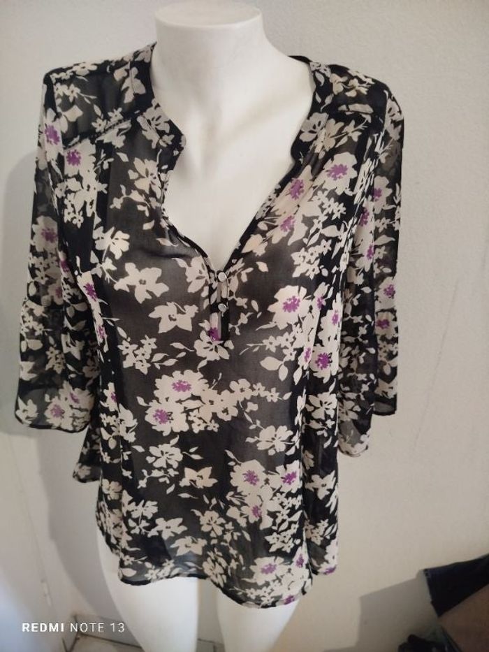 #kytie38femme. Chemise blouse manche 3/4 de marque maison 123 col v en voile fleurie sur fond noir en excellente état comme neuve manche évasé mesure des épaules 40 cm mesure des aisselles 45 cm hauteur 60 cm évasé sur le bas surpiqué avec 2 petit bouton miroir sur le col ref V123
