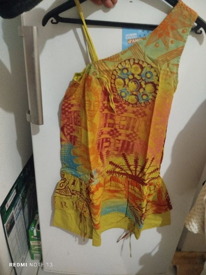 #kytie6ansfille. Robe sans manche taille 6 ans se ferme par une fermeture éclair sur le côté un côté avec une manche bretelle l'autre côté sans manche en débardeur avec de petits nœuds et lanières sur le bas de la robe réglable pour faire des fronces de marque tape à l'oeil dégriffé la robe est en état neuve ref L42