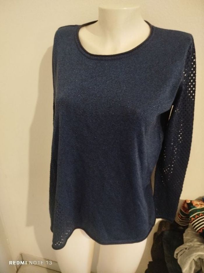 #kytieSfemme. Haut manche 3/4 taille S de marque trend oversize de couleur marine bleu marine pailleté argenté col rond léger et fin et fluide peu aussi aller pour une taille M/L et XL en maille sur une partie d une manche 3/4 L autre manche et en maille et aussi sur le côté droit en état neuf 47 % viscose 27 % coton 17 % polyester 9 % fibre métallique mesure des aisselles 72 cm hauteur 65 cm réf TDR