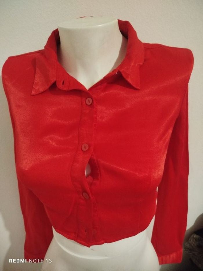 Chemise courte manches longues taille XS de marque dont call me de Jennyfer se ferme par des boutons devant satiné rouge 100% viscose brillante en état neuve réf FJ34