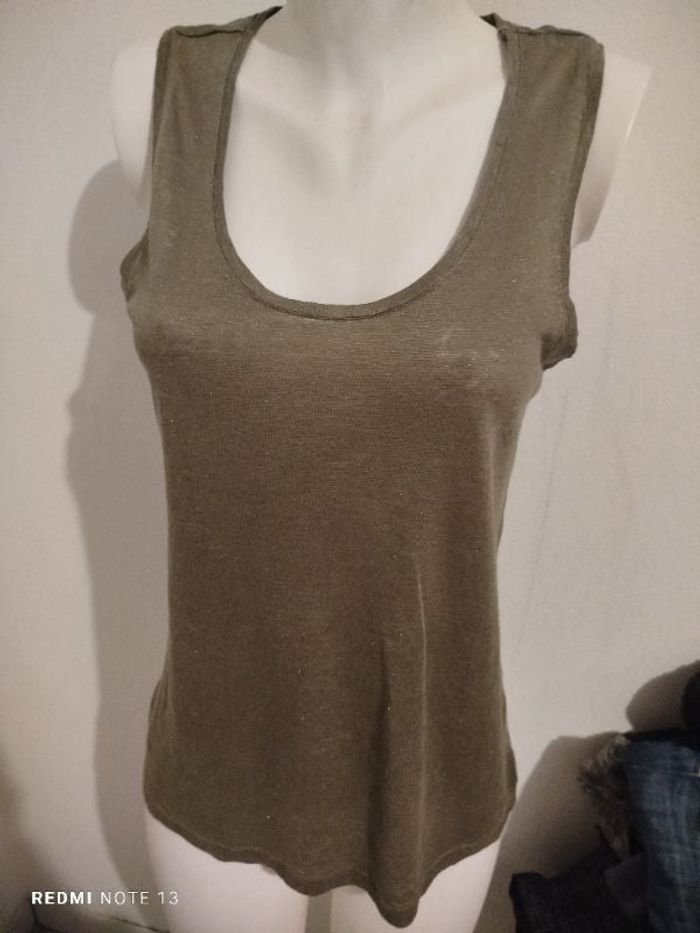 #kytie42femme. Débardeur taille 42/44 fluide et souple de couleur kaki pailleté doré de marque u collection mesure des vaisselle 45 cm hauteur 65 cm en état excellent état neuf réf H74