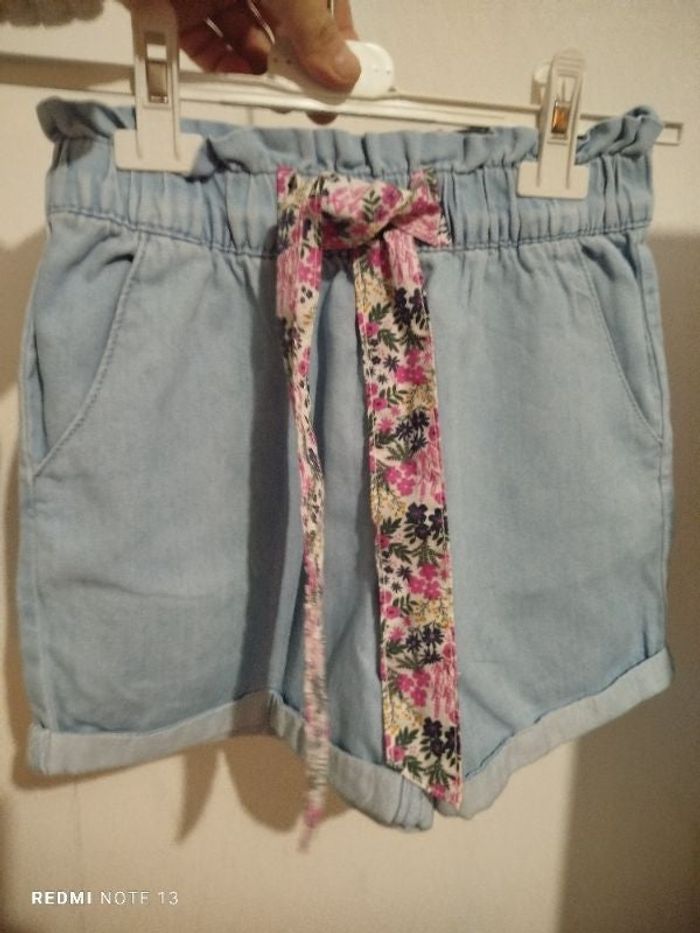 #kytie8ansfille. Sorte en jean léger et souple taille haute taille élastique avec un petit ruban Fleury pour faire un petit nœud sur le devant en excellente état en état du neuf de marque tape à l'oeil pour Chavant reverse sur le bas des cuisses ref 342T