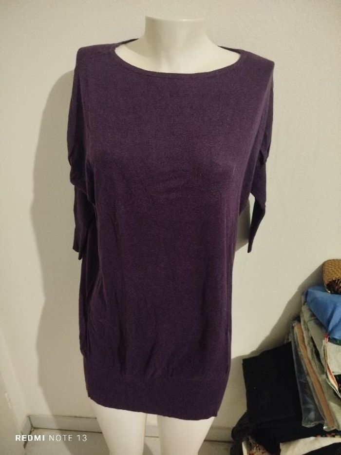 #kytieMfemme. Robe pull légère manches 3/4 et côtelé taille M/L col rond de marque classic tricot de couleur violet 55 % viscose 45 % laine 15 % llin 5% elasthan mesure des aisselles 55 cm hauteur 80 cm en excellente état comme neuf réf CM34