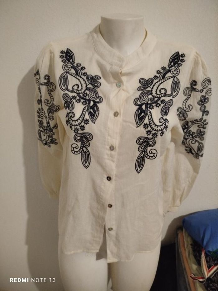 #kytieSfemme. Chemisette manches longues taille S/M de marque Milo'S de couleur crème brodé noir sur le devant et les manches transparente mesure des épaules 36 cm aisselles à aisselles 40 cm hauteur 60 cmref Mil34