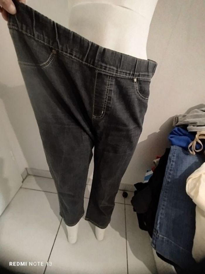 #kytie48femme. Pantacourt taille 48 de marque Gémo de couleur gris anthracite noir taille élastique en super état comme neuf taille élastique mesure de la taille 48 cm tour de cuisse 65 cm hauteur 82 cm et le bas 38 cm fausse poche avant vrai poche arrière réf G48