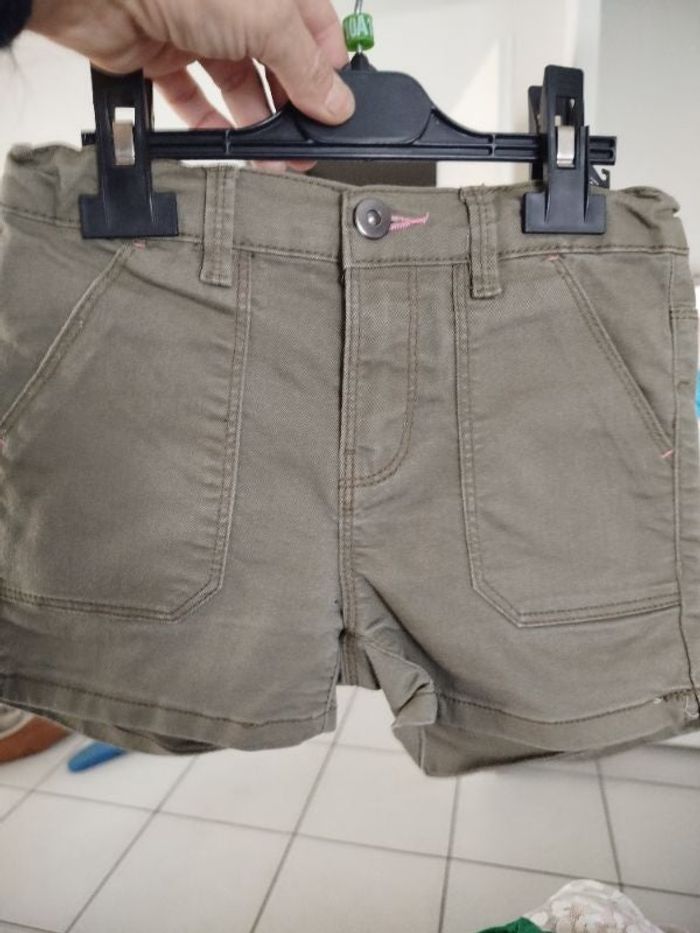 #kytie9ansfille. Short taille 9 ans zippé avec un bouton poche avant et arrière de marque u essentielles en état neuf taille réglable de couleur kaki en jean léger reg J45