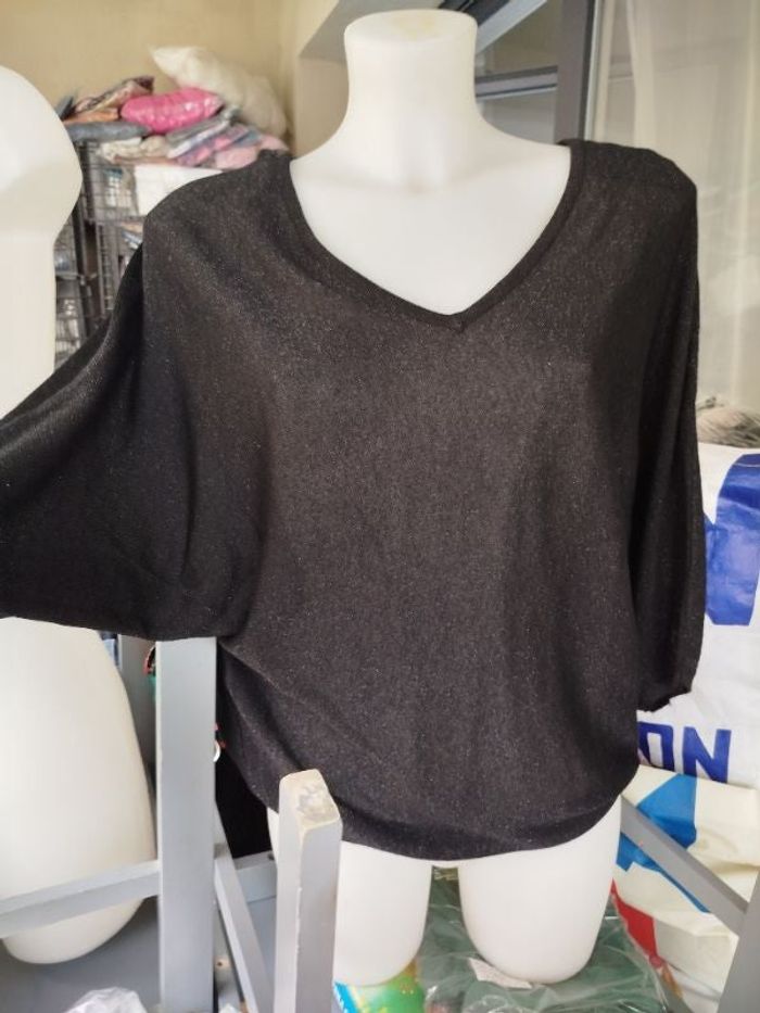 #kytieMfemme. Tunique oversize courte fluide légère noir et métal argenté voile plumetie dans le dos en V de marque Camaïeu manche 5/4 mesure des esselles 70 cm hauteur 70 cm 77 % viscose 15% polyester 8% fibre métal le voile 100% polyester neuf avec étiquette réf cam34